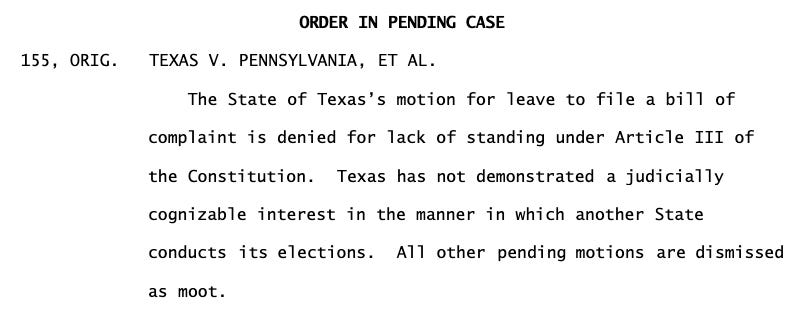 The crux of the argument, as such, in the denied filing was that the elections results assert that a lot of people voted for the Democratic party’s candidate who usually vote for the Republican party’s candidate in the 2020 Presidential election. It further asserts that this is statistically unlikely, so the vote must be corrupt and fradulent. It asks the court to order the Republican state legislatures in four states to send electors to the college instead of those already certified to attend.