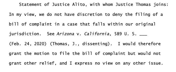 While we’re here, let’s take a look at what Justices Alito and Thomas, those closest to the hearts of the last tattered vestiges of political loyalty to Trump, felt compelled to add: